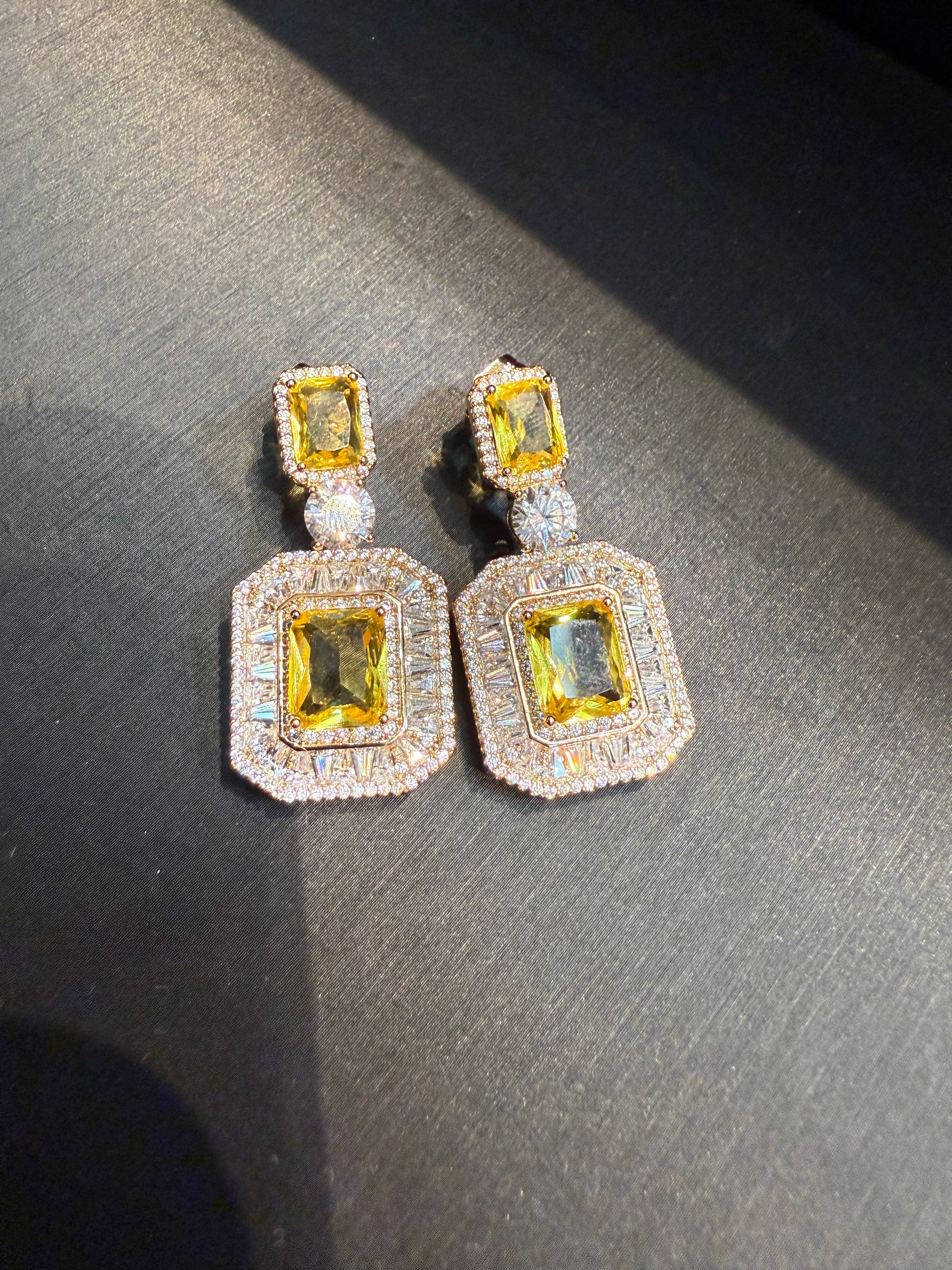 Experience the allure of a radiant emerald-cut yellow stone, surrounded by sparkling clear crystals, exuding luxury and sophistication. Crafted with a Gold Filled base, these earrings offer unmatched durability and the brilliance of genuine gold.