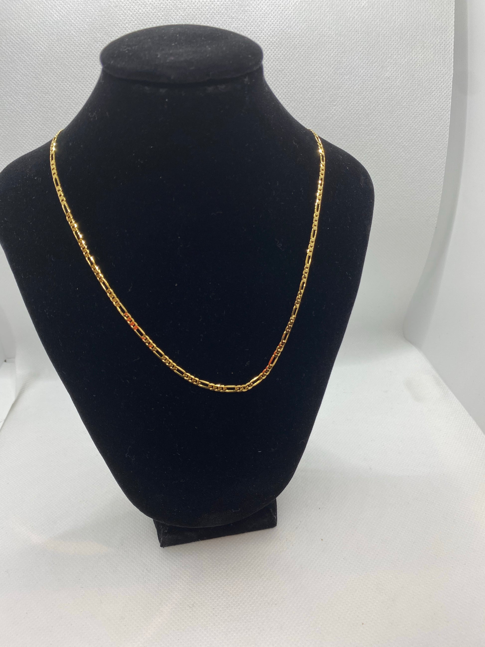 18 K Gold Plated Figaro Chains.This classic and elegant jewelry has a warm golden-bronze finish that exudes warmth and robustness, and its Figaro link-chain design boasts fine craftsmanship that ensures longevity.Available in different sizes.