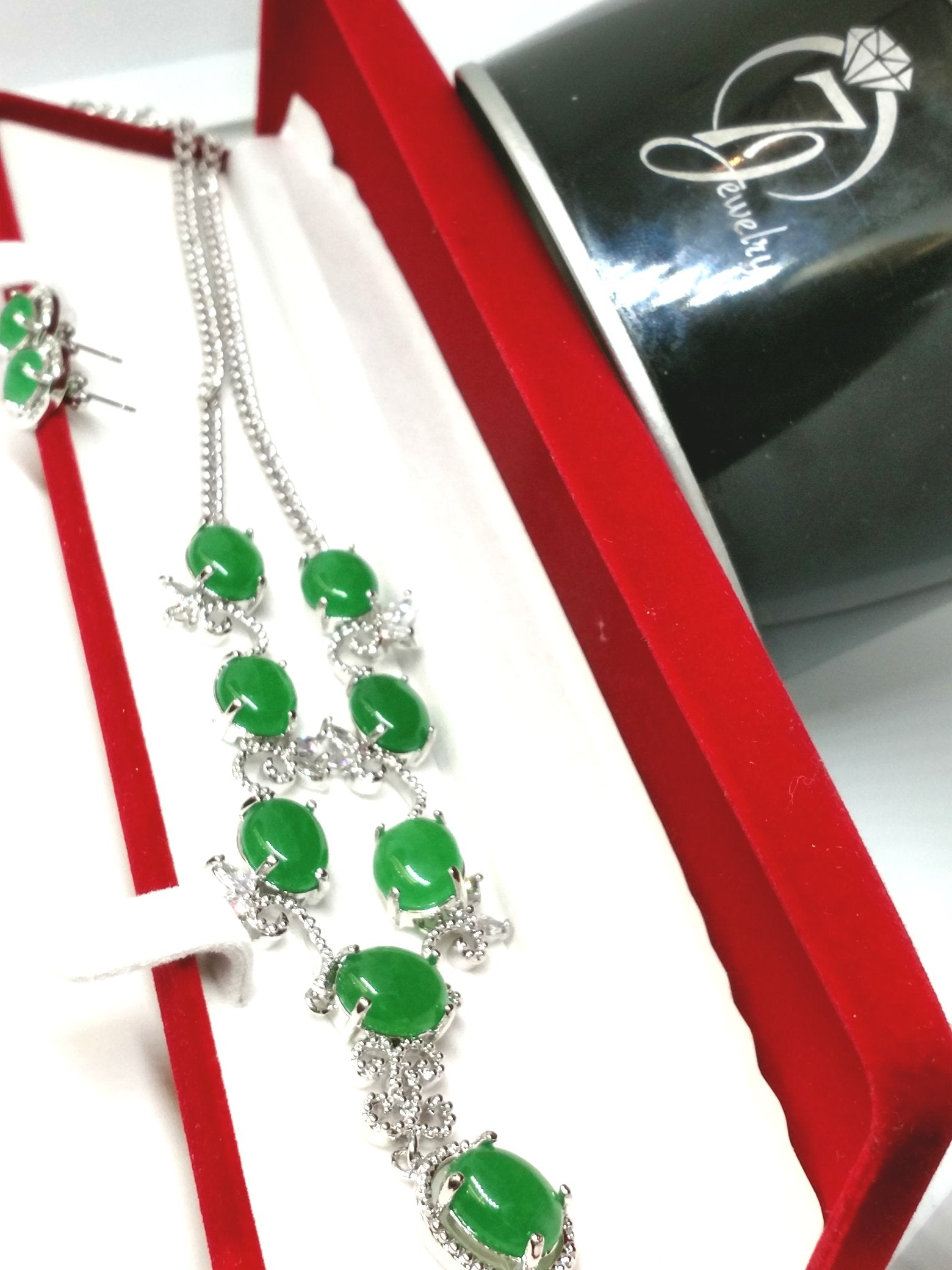 20th century Inset with diamonds and cabochon jade.Very good quality and elegant set. Marked 750 for 18-karat gold. Necklace (closed): 9" length x 5" Excellent condition. Ready to wear.