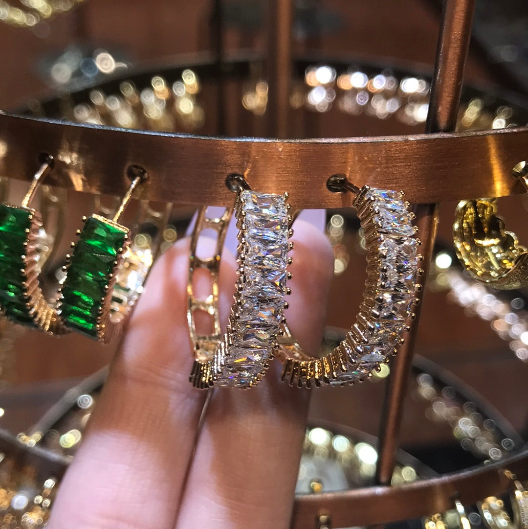 18K Gold Plated Diomand clustered hoop earrings. Cubic zirconia diomands also known as American diomands. Very trendy and stylish. goes with any outfit wether it be casual night. Very popular among women